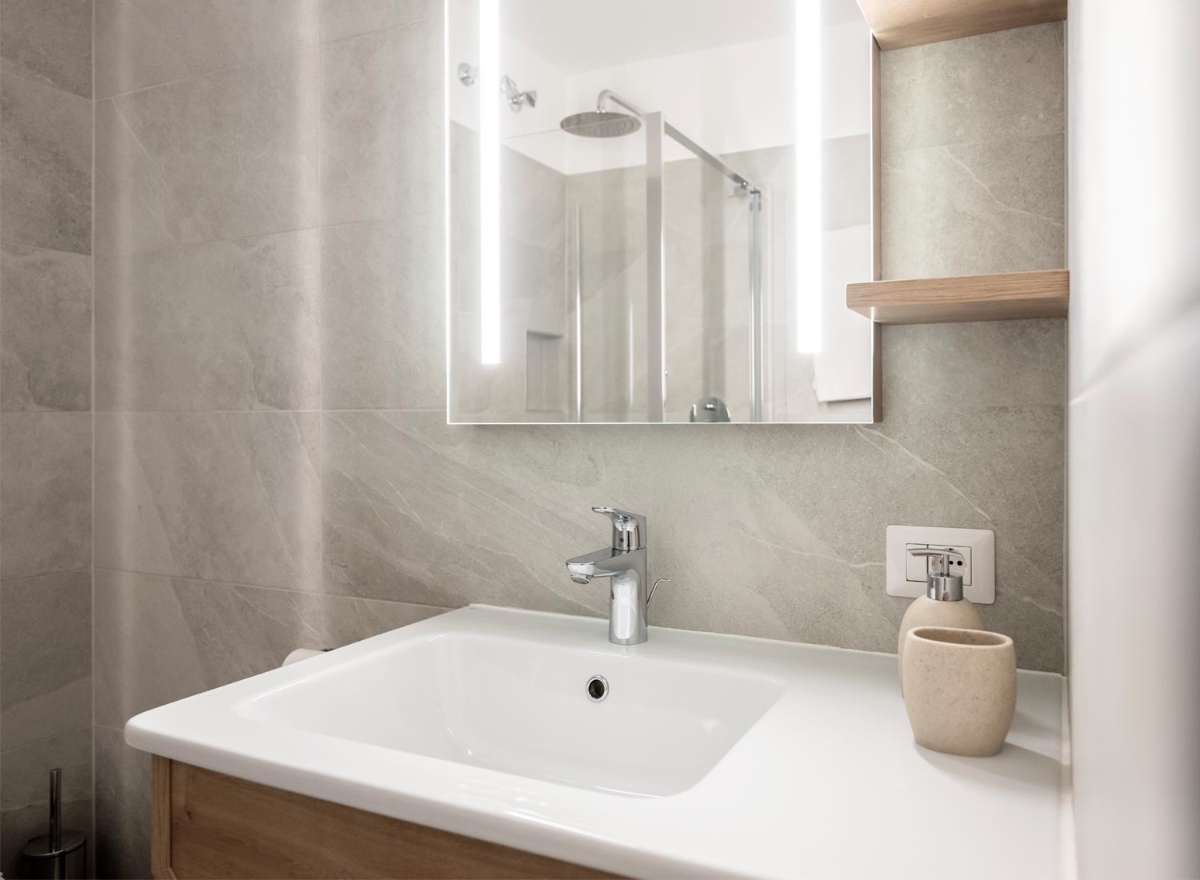 Badezimmer mit Dusche, Waschtisch und Fön